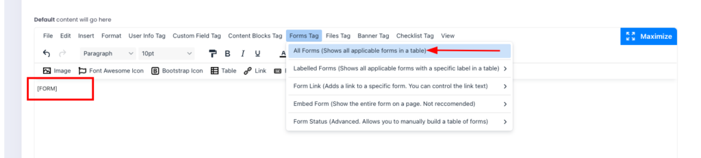 – From the Forms Tag Dropdown, choose “All Forms”. The tag [FORMS] will automatically appear in the editor box.