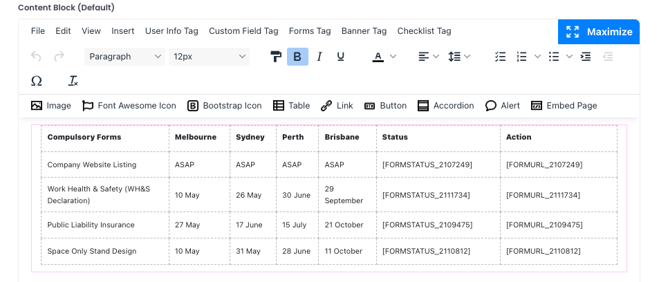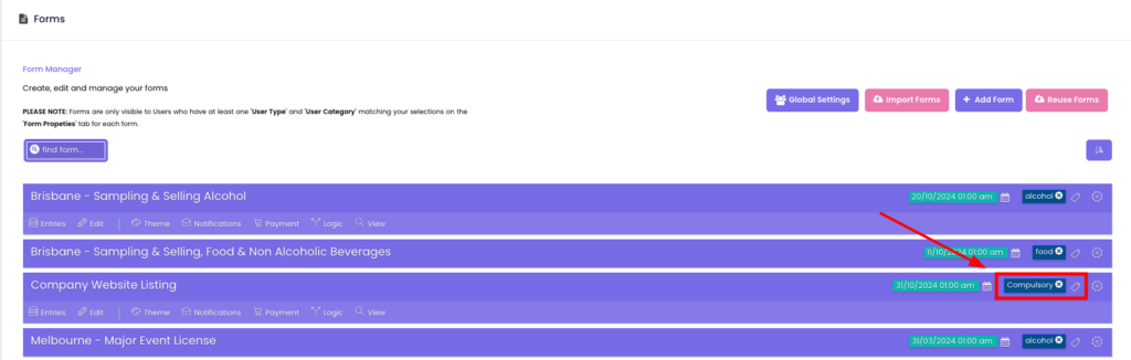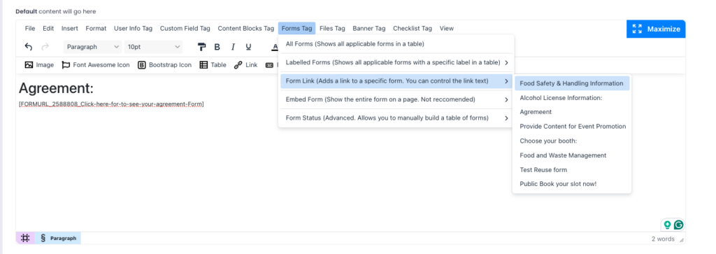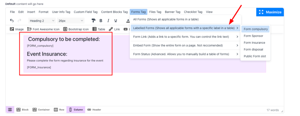 – From the Forms Tag Dropdown, select “Labelled Forms”, and select the label you assigned (e.g., COMPULSORY). The tag [FORM_COMPULSORY] will appear in the editor box.