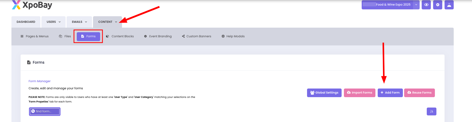 Navigate to Content/Forms. In the top right corner of the page, there is a button labelled “+ Add Form”. Click this button.