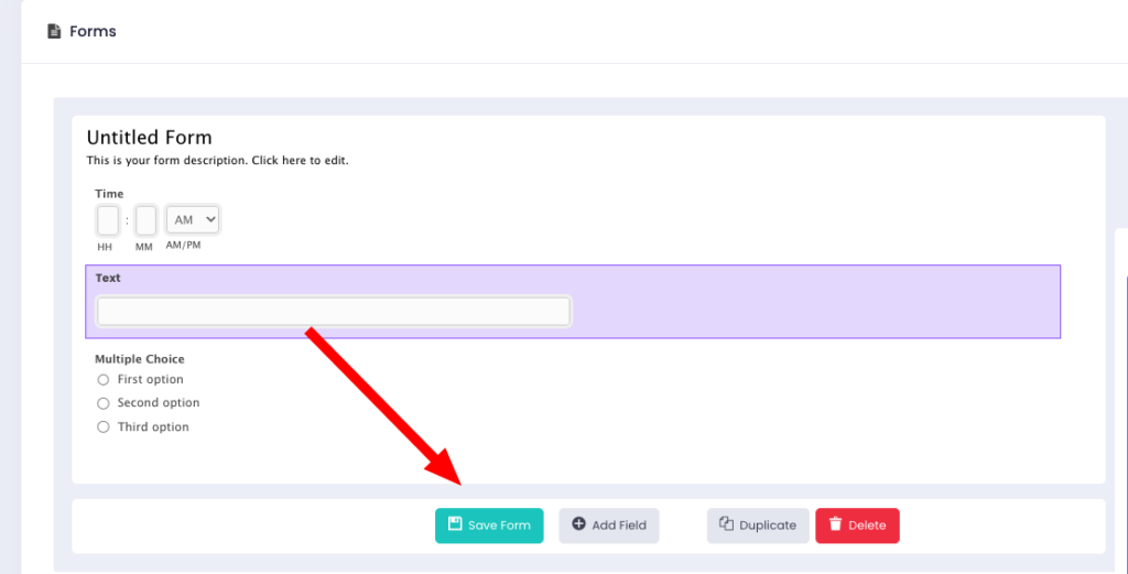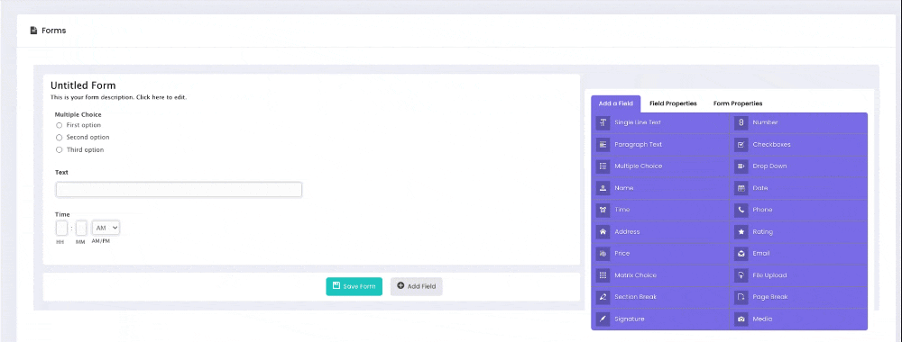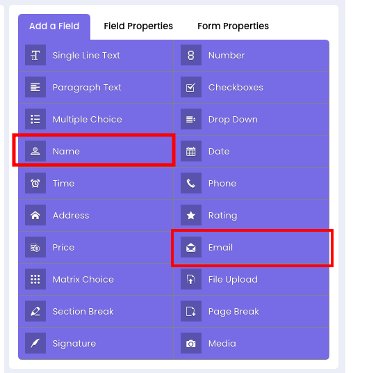 On the Forms page, click the field buttons on the right side of the form builder or drag the button into the preview pane. This will add fields to the form.