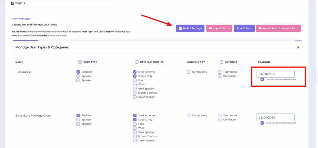 • Form Deadline: After saving the form, click Global Settings to set a submission deadline if needed. You can also choose to disable submissions once the deadline has passed.