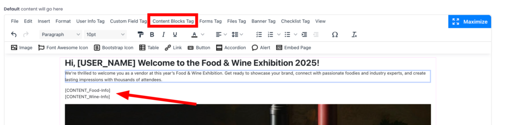 – Use dynamic tags to insert previously created content such as forms, content blocks, files, banners, or user checklists.
