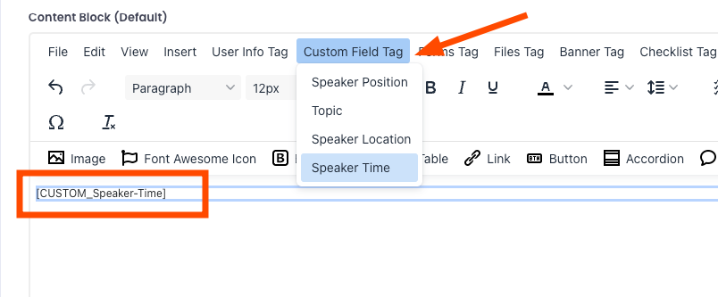 Once a custom field is created, the system generates a tag for it (e.g., [CUSTOM_Speaker-Time]). Use this tag to dynamically display user-specific details in content.