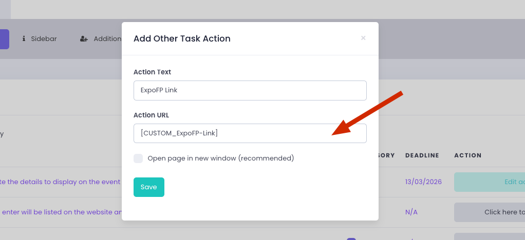 When creating the task, select Other Task, then insert the relevant custom field tag into the Action URL field. This allows the system to dynamically direct each user to their personalised content when they click the task.