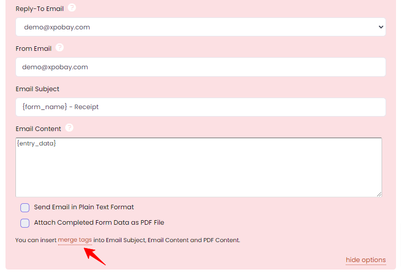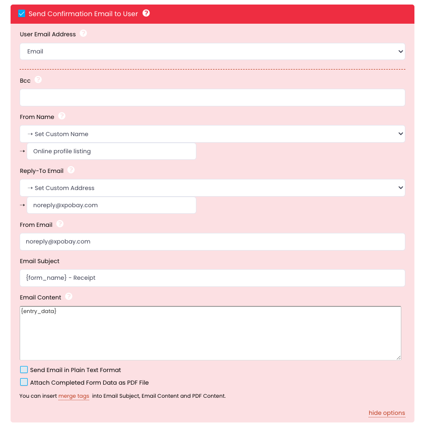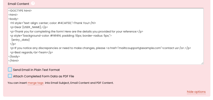 When the email is sent, the merge tags will automatically be replaced with the corresponding data from the user’s form submission. For example: