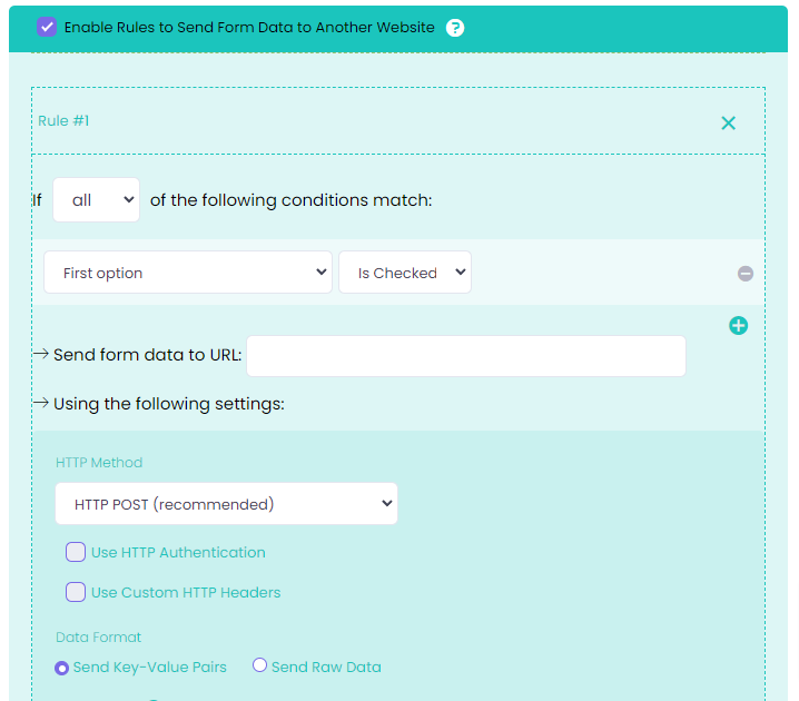 Also referred to as Webhook Logic, this feature enables seamless integration of your form with external services such as MailChimp, CampaignMonitor, or any platform that supports HTTP API.