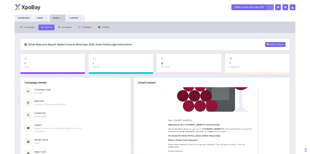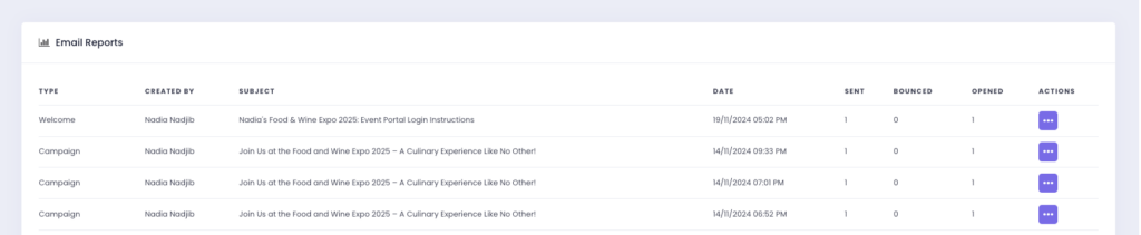 The Reports and Saved Reports features help organisers track communication performance and keep their events on track by focusing on the most relevant data.