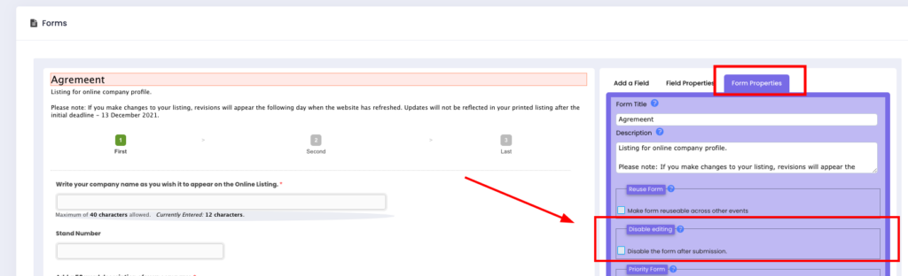 To disable form editing after submission: Tick the checkbox labelled Disable Editing.