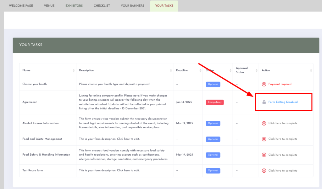 Organisers in XpoBay have the flexibility to control whether users can edit their submitted forms. This feature ensures data integrity while allowing updates when needed. By default, users can edit their submissions unless this option is disabled. Follow the steps below to manage this setting.
