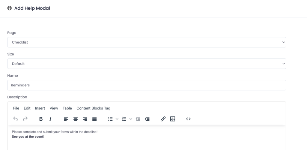 2. Click Add Help Modal and give your modal a descriptive name to reflect its purpose.