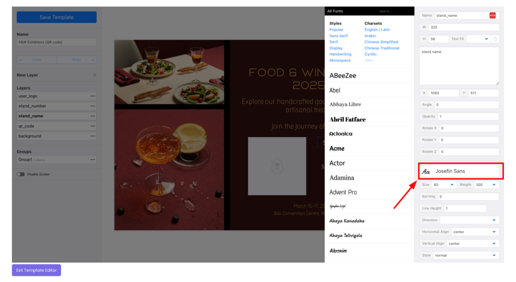 When creating a template and adding text boxes, you can select specific fonts for each text box to align perfectly with your design goals and branding.