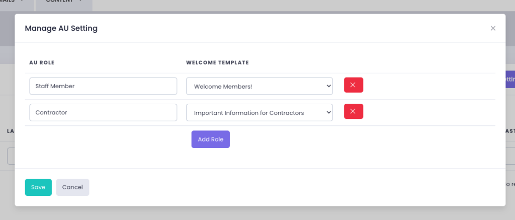 • Add new roles (e.g., Staff Member, Contractor) and assign the corresponding welcome email templates.