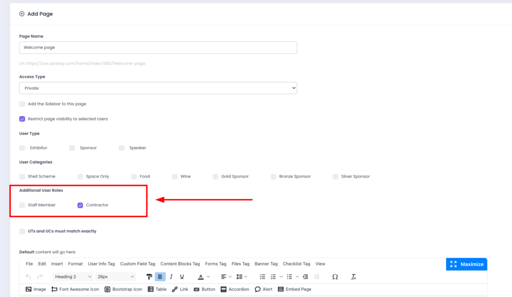 Outcome: Only Additional Users with the Contractor role will see the page. All other users, including Parent Users and AUs without the Contractor role, will not have access.