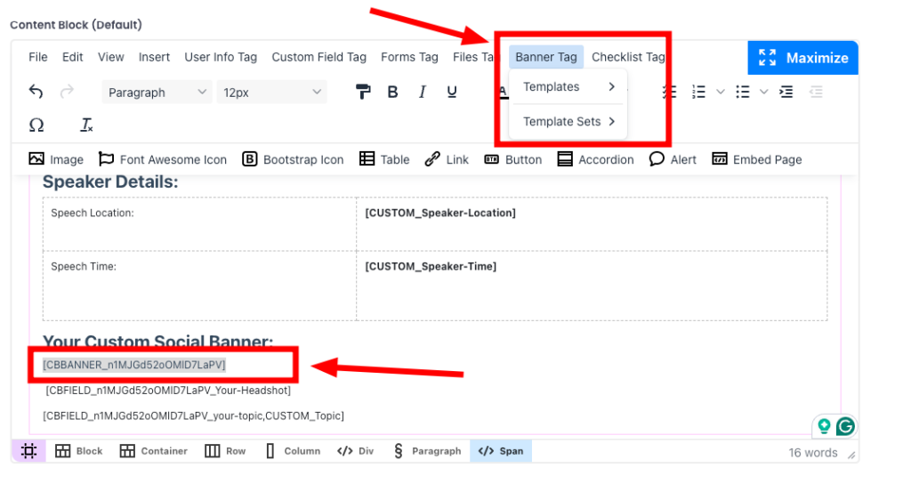 2. Once created, each content block automatically generates a replacement tag.